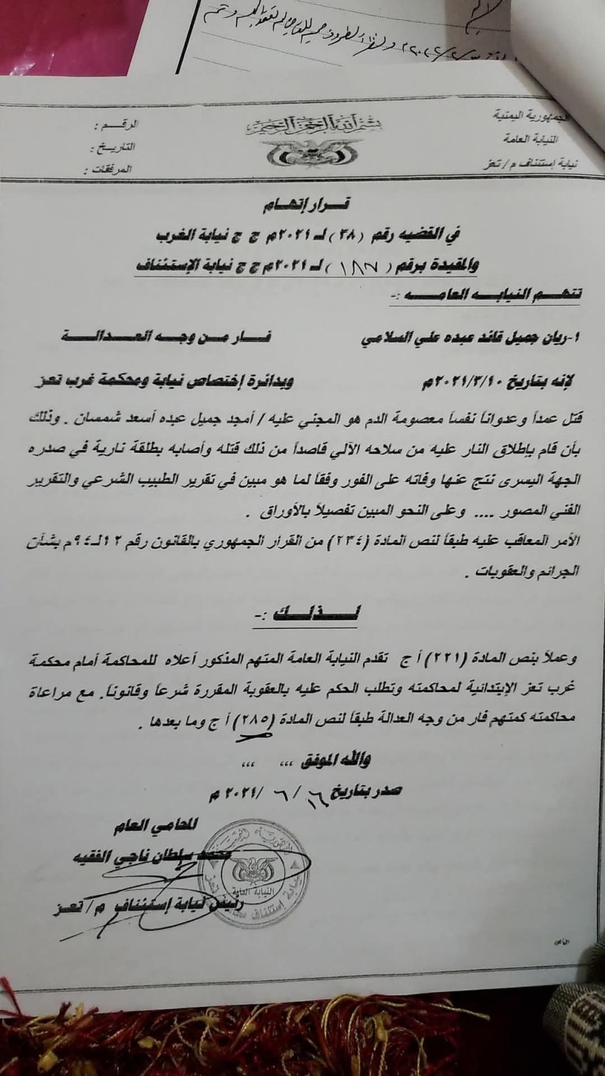 تفاجأت أسرة الشاب أمجد جميل عبده أسعد في محافظة تعز، بفرار قاتل نجلها إلى خارج البلاد بوثائق مزوّرة بعد أن غيّر هويته الرسمية، وفقاً لبيان صادر عن الأسرة.