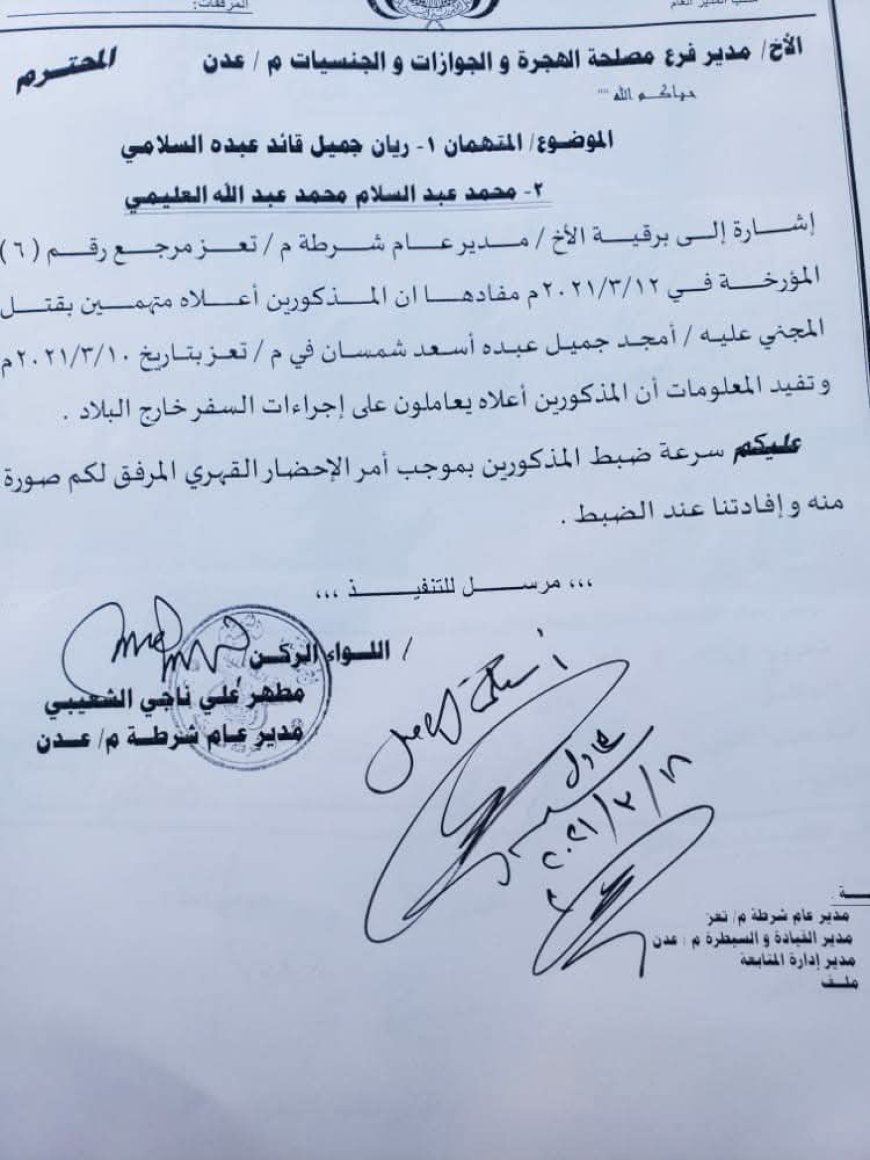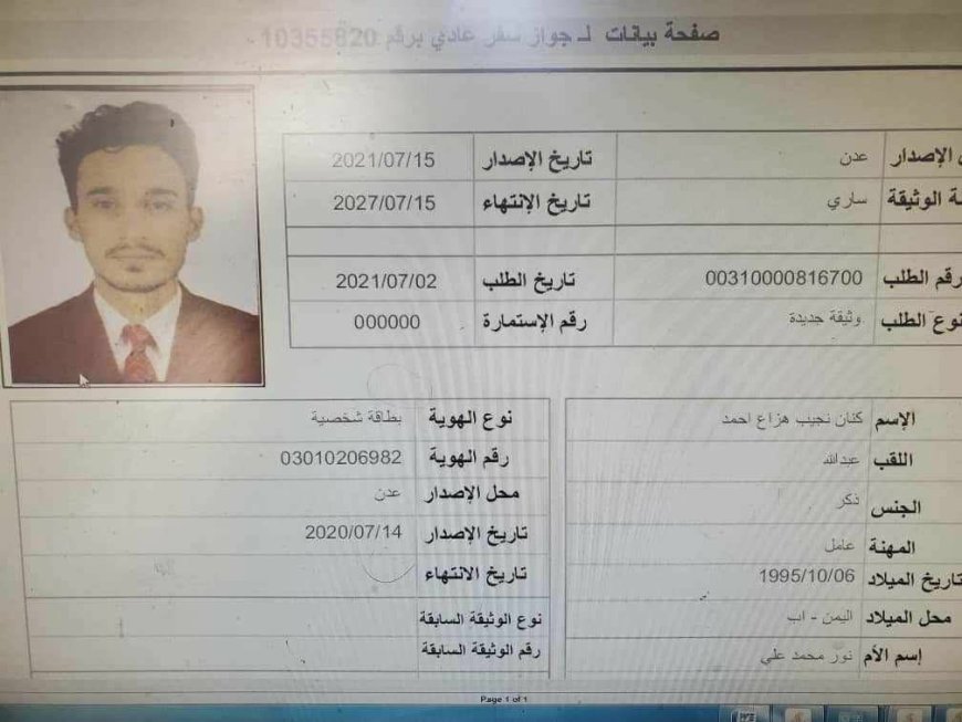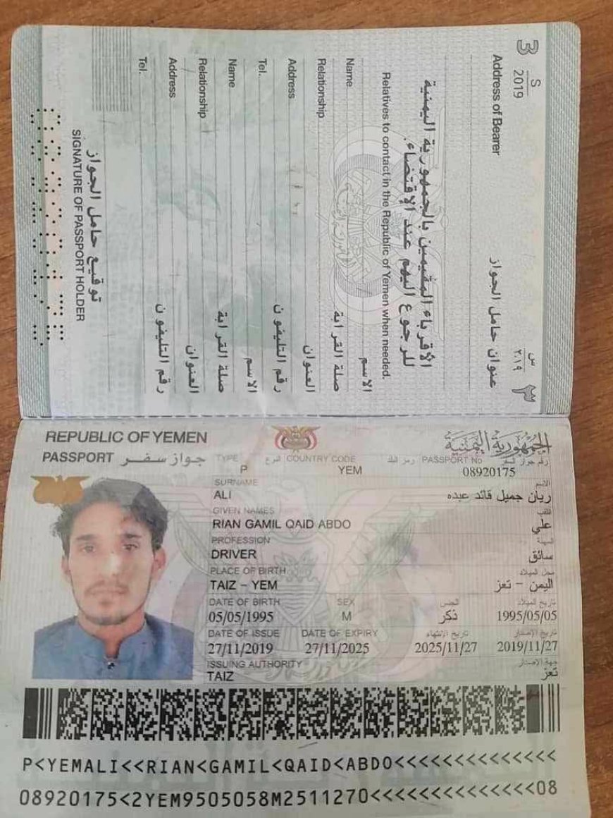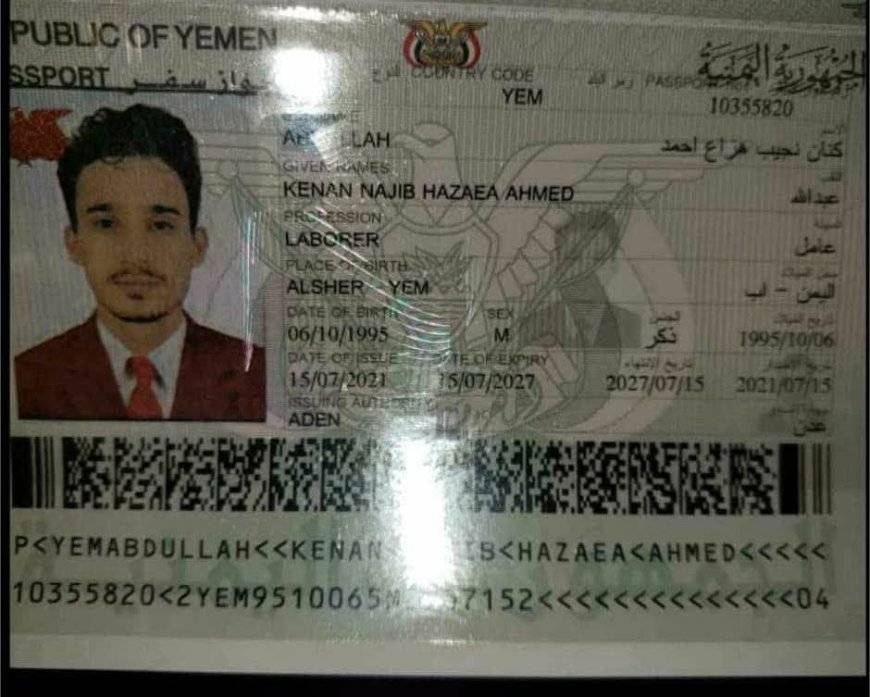 وأوضح أن الجواز الأصلي للقاتل يحمل اسم ريان جميل السلامي وتاريخ إصداره 29 ديسمبر 2015، بينما صدر الجواز المزور بتاريخ 15 يوليو 2021، مطالبًا بالكشف عن الجهات أو الأفراد الذين سهّلوا عملية تزوير الوثائق واستخراج الجواز الجديد من مصلحة الجوازات بعدن.