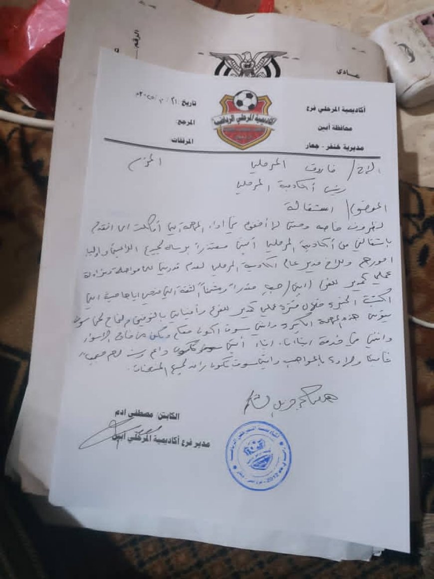 وصفها لظروف خاصة ..قدم الكابتن مصطفى آدم استقالة من أكاديمية المرحلي لكرة القدم م/أبين ..جعار بعد عام كامل من تولية إدارة الأكاديمية معتذرا لمدير عام الأكاديمية الكابتن فاروق المرحلي و اللاعبين وأولياء أمورهم عن مواصلة ومزاولة العمل كمدير للفرع في أبين / جعار على حد وصفه في رسالة الاستقالة .