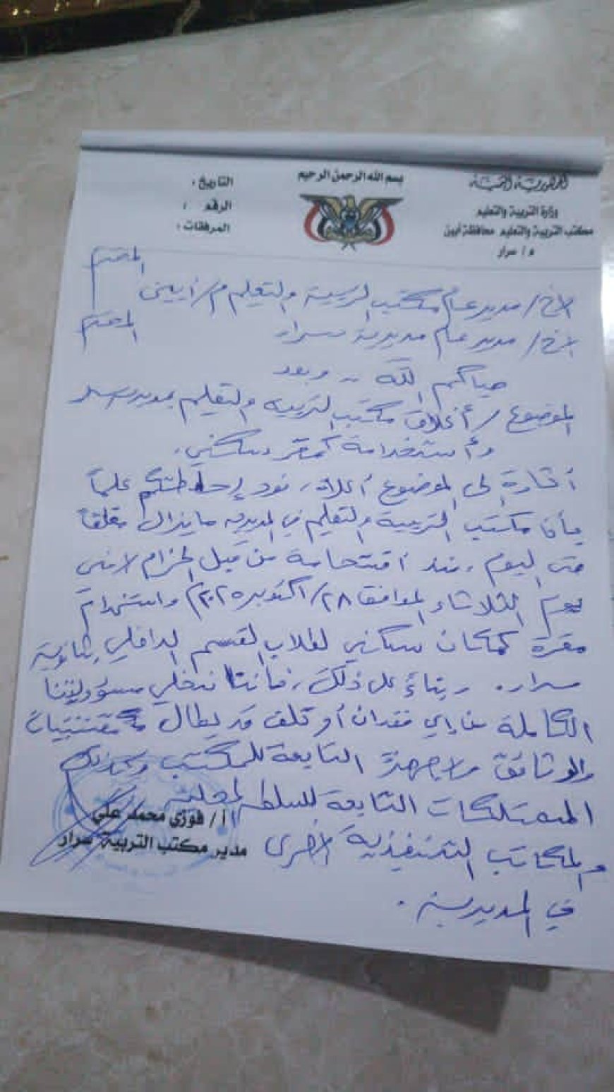 وأوضح المخيري، في مذكرة رسمية وجّهها إلى مدير عام مكتب التربية والتعليم بمحافظة أبين ومدير عام مديرية سرار،اليوم الأحد، أن المكتب ما يزال مغلقًا حتى اليوم، مؤكدًا أن إدارته تخلي مسؤوليتها الكاملة من أي فقدان أو تلف قد يطال الوثائق والمعدات والأجهزة التابعة للمكتب وللسلطة المحلية والمكاتب التنفيذية الأخرى التي تتخذ من مبنى التربية مقراً لعملها.