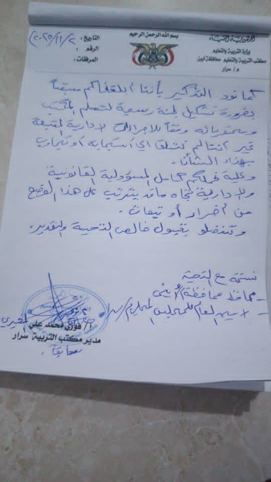 وحمّل المُخيّري في ختام مذكرته الجهات المعنية كامل المسؤولية القانونية والإدارية عن أي أضرار أو تبعات قد تنجم عن استمرار إغلاق المكتب واستخدامه خارج مهامه الرسمية، داعياً إلى التدخل العاجل لإعادة الوضع إلى طبيعته وتمكين إدارة التربية من أداء مهامها الإدارية والتعليمية تجاه طلاب المديرية.