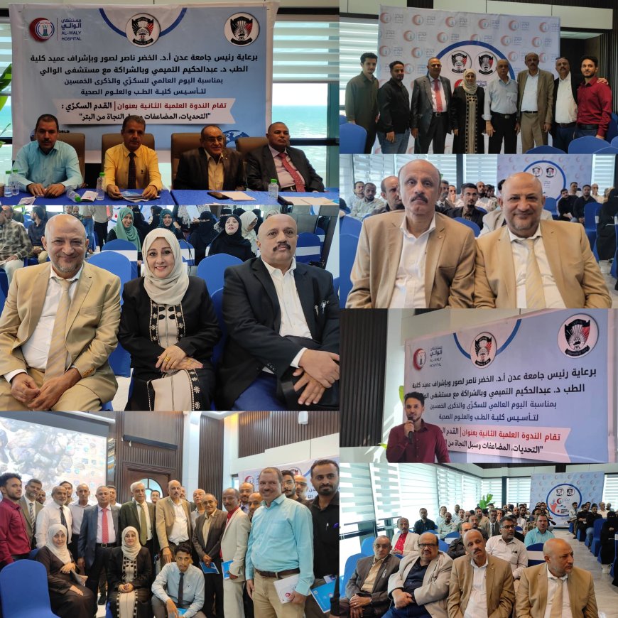 بالشراك مع مستشفى الوالي النموذجي في العاصمة عدن اليوم الندوة العلمية الثانية بمناسبة اليوم العالمي للسكري، بعنوان: "القدم السكري: التحديات والمضاعفات وسبل النجاة من البتر"، وذلك في إطار الاحتفال بالذكرى الخمسين لتأسيس كلية الطب، وتحت رعاية رئيس جامعة عدن الأستاذ الدكتور الخضر لصور وإشراف عميد كلية الطب الدكتور عبد الحكيم التميمي.