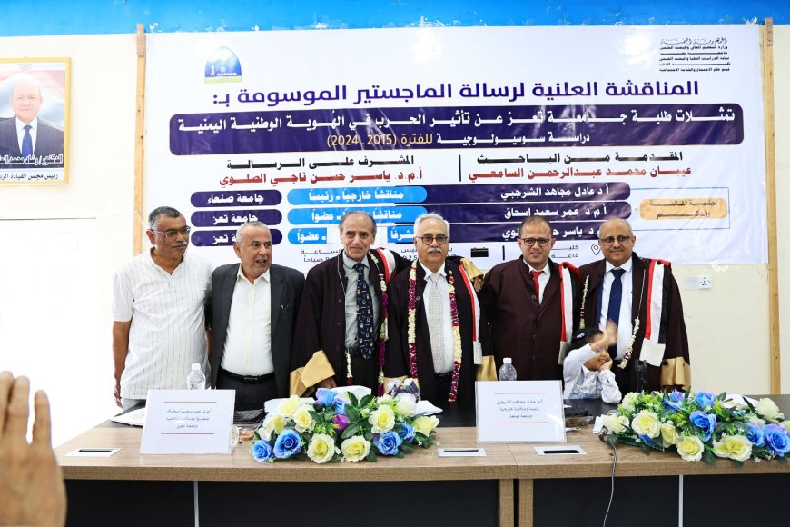 حصل الباحث عيبان محمد عبدالرحمن السامعي على درجة الماجستير في علم الاجتماع بتقدير امتياز من جامعة تعز، وذلك عن رسالته الموسومة بـ "تمثّلات طلبة جامعة تعز عن تأثير الحرب في الهُوية الوطنية اليمنية: دراسة سوسيولوجية للفترة (2015 – 2024)"