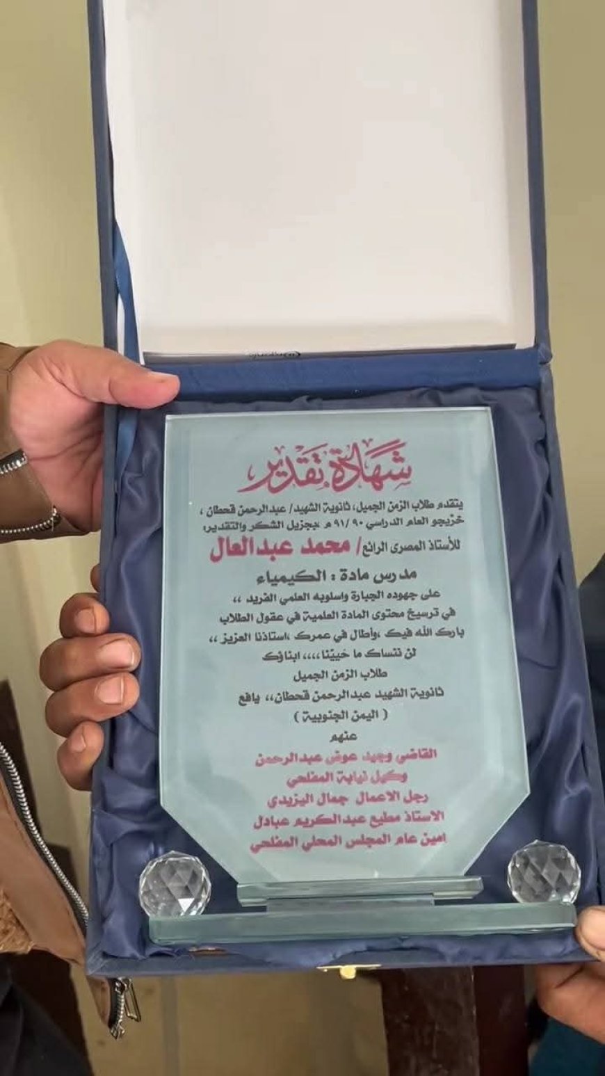 وفي لحظة رمزية قدّموا له شهادة تقديرية لم تكن مجرد ورقة بل كانت رسالة امتنان وأخلاق ووفاء لكل جهد بذله ولكل كلمة قالها ولكل درس علمهم أن الحياة أكبر من مجرد أرقام ونتائج وأن القيم تبقى خالدة في الأذهان.