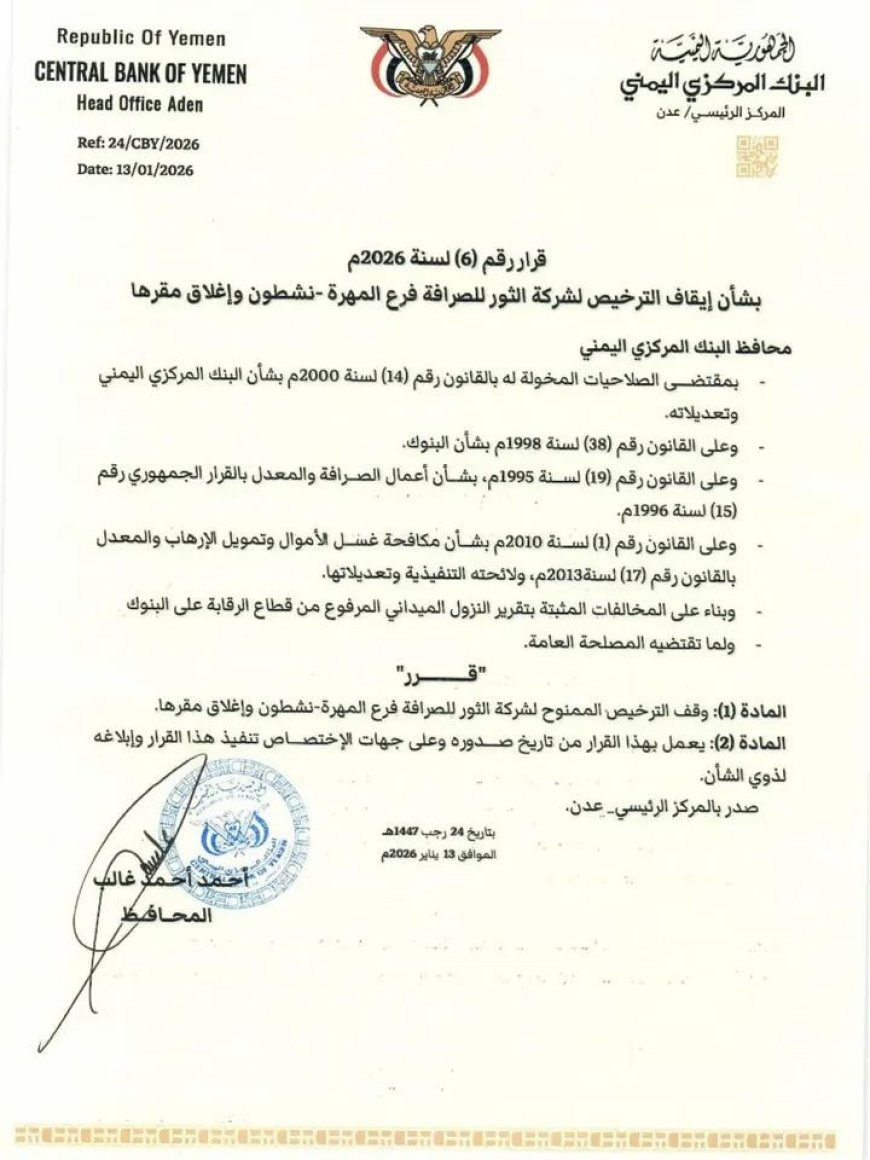 أصدر محافظ البنك المركزي، أ. أحمد أحمد غالب، قرارين رقم (5) و (6) للعام 2026م، يقضيان بإيقاف التراخيص الممنوحة لعدد من منشآت الصرافة المخالفة وإغلاق مقراتها، وذلك بعد ثبوت المخالفات عبر تقارير النزول الميداني المقدمة من قطاع الرقابة على البنوك، ومن بينها فرع شركة الثور للصرافة بمحافظة المهرة