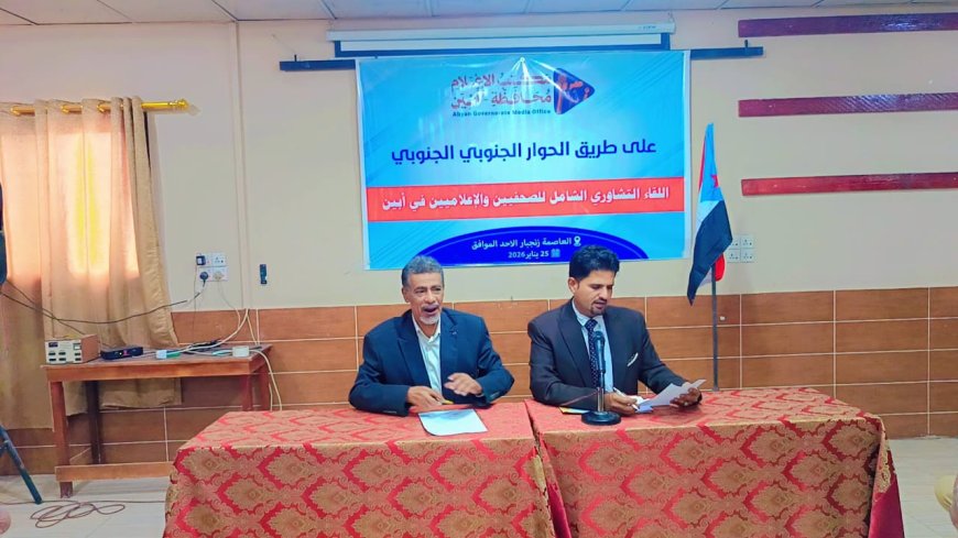 انطلاقًا من المسؤولية الوطنية والمهنية، وحرصًا على تعزيز دور الإعلام في ترسيخ قيم الحوار والتقارب، وتفاعلا مع واقع المحافظة والارتقاء بخدماتها نحو الافضل عُقد اللقاء التشاوري الشامل للصحفيين في دلتا محافظة أبين بالعاصمة زنجبار ، برئاسة الدكتور ياسر باعزب مدير مكتب الإعلام محافظة ابين والاستاذ محمد ناصر العولقي رئيس مجلس نقابة الصحفيين والإعلاميين الجنوبيين فرع ابين و بمشاركة نخبة من الصحفيين والإعلاميين، لمناقشة مستجدات الساحة الجنوبية بشكل عام ومحافظة ابين بصورة خاصة ودور الإعلام في دعم كافة الجهود المبذولة في ايجاد حل عادل للقضية الجنوبية وفق ارادة الشعب الجنوبي.