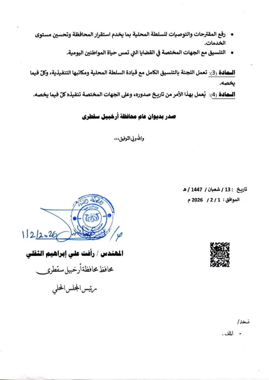 أصدر محافظ محافظة أرخبيل سقطرى أمرًا إداريًا رقم (6) لسنة 2026م، يقضي بتشكيل لجنة من مشايخ وأعيان المحافظة، وذلك في إطار تعزيز الدور المجتمعي ودعم جهود السلطة المحلية في مواجهة التحديات الخدمية والمعيشية التي تمر بها المحافظة.