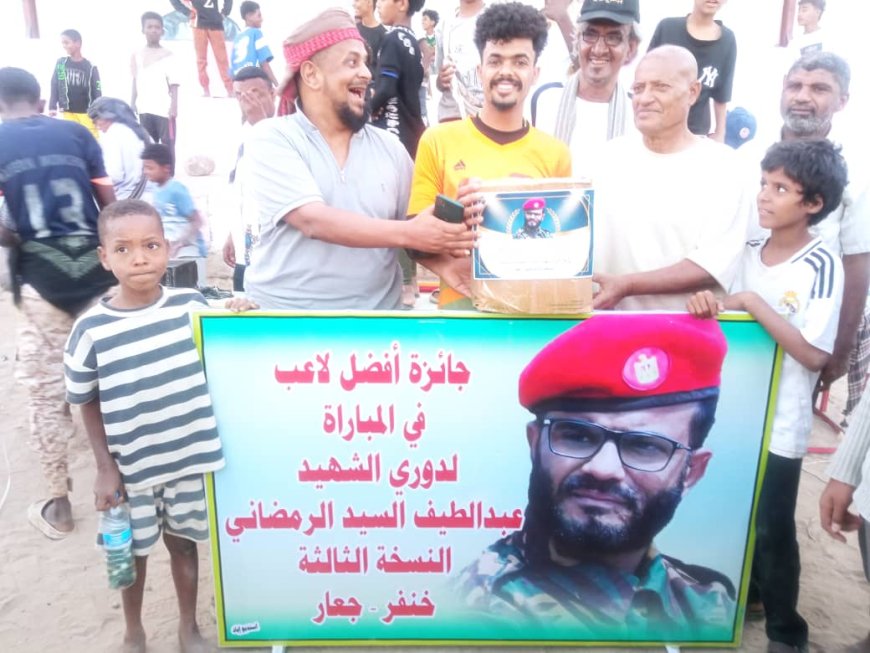 حقق فريق الجبل فوزًا مستحقًا على فريق الوصل بهدف نظيف، في اللقاء الذي أقيم عصر اليوم الاثنين على ملعب الشهيد عبداللطيف السيد (البيتي) سابقا، ضمن منافسات بطولة الشهيد القائد عبداللطيف السيد ورفاقه بجعار، التي تأتي برعاية كريمة من القائد عبدالسلام عارف، والعميد عبدالرحمن الشنيني، قائد جهاز مكافحة الإرهاب بمحافظة أبين، والعميد أبو مشعل الكازمي، مدير أمن محافظة أبين، والأستاذ المحامي مازن بالليل اليوسفي، مدير عام مديرية خنفر، والقائد أحمد عسيري، والأستاذ مروان باقس.
